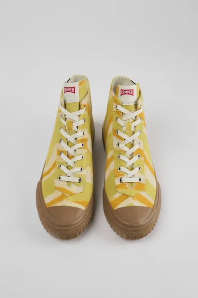 Multicolored organic cotton men’s sneakers with hand-drawn batik uppers made in collaboration with the Ethical Fashion Initiative and rubber outsoles (40% natural, 23% recycled).
