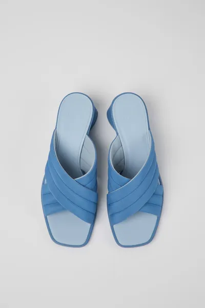 Blue textile women’s sandals with OrthoLite® Recycled™ non-removable footbeds and rubber outsoles.