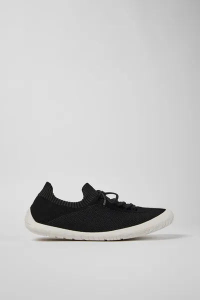 Black men’s sneakers with recycled polyester & elastane one-piece knit, lace closures, recycled OrthoLite® footbeds, and rubber outsoles.