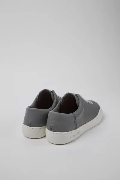 Gray leather women’s sneakers with recycled OrthoLite® footbeds and EVA outsoles.
