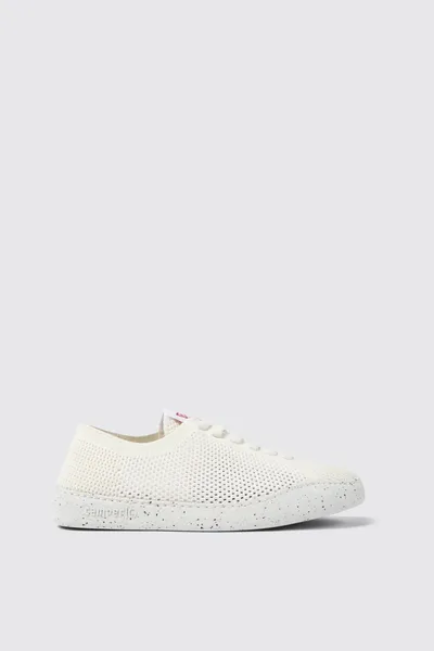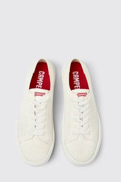 White recycled PET women’s sneakers with OrthoLite® Recycled™ footbeds, elastic laces, and recycled EVA outsoles (20% recycled).