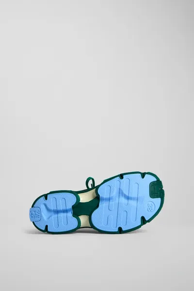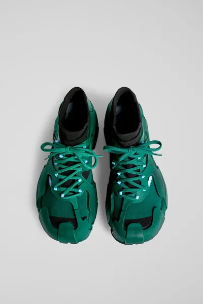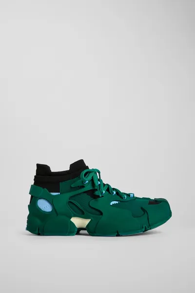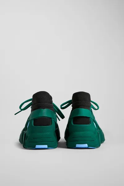 Green and black caged sneakers with water repellent 3D-knitted PET sock interiors, direct injection TPU exteriors, and recycled PU outsoles. Fully recyclable.